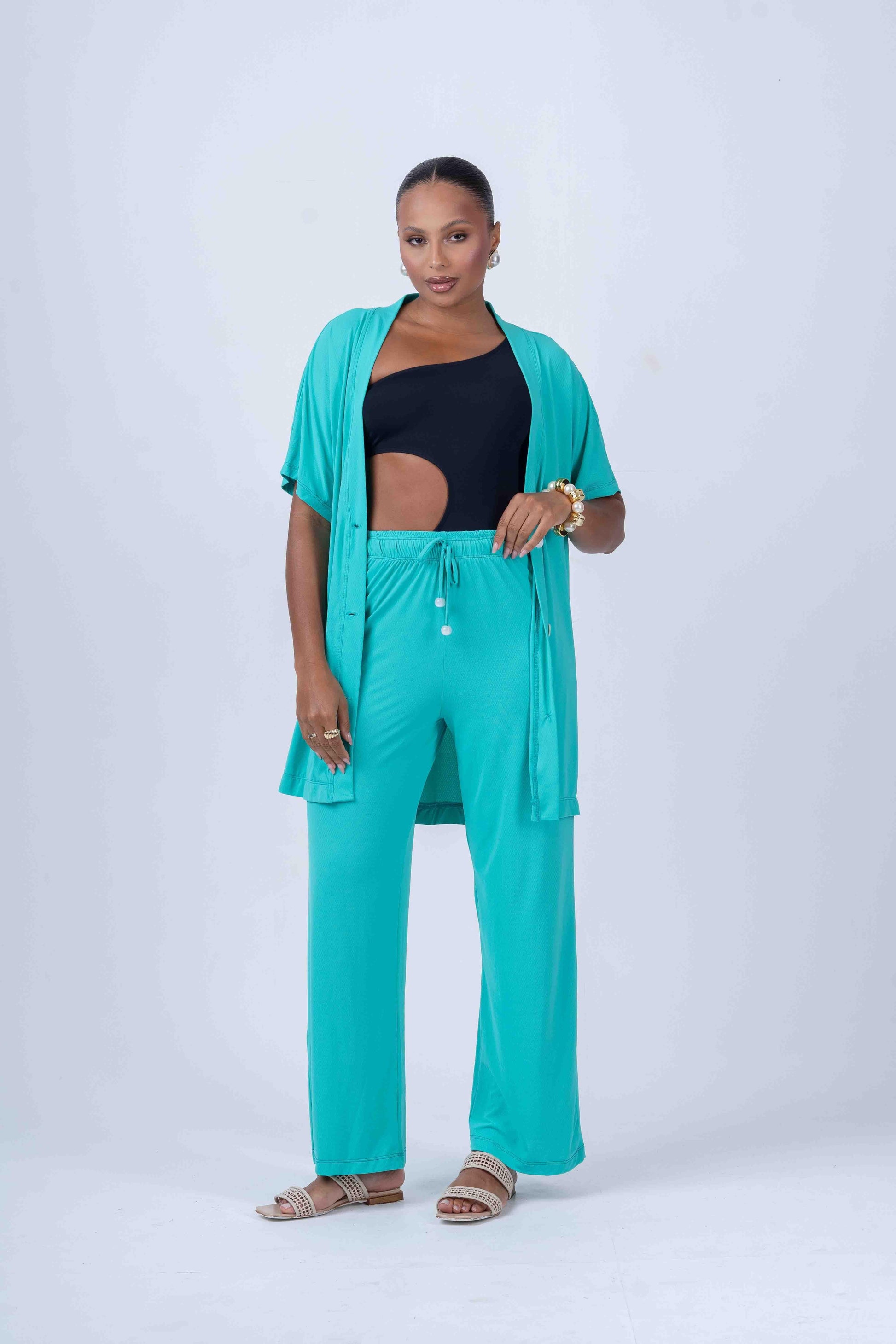 Com a Calça Pantalona Beach Verde Piscina, você garante um visual sofisticado, leve e confortável para aproveitar o melhor do verão, seja na praia, piscina ou em momentos de lazer.