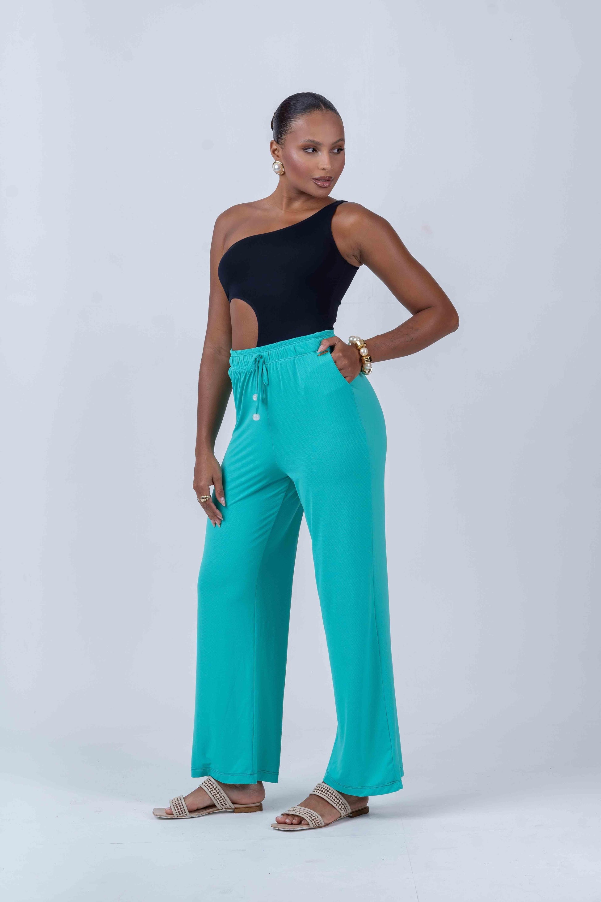 A Calça Pantalona Beach Verde Piscina é a escolha ideal para quem busca elegância, conforto e sofisticação em um único look. Com um tecido liso na cor verde piscina, essa peça é perfeita para quem deseja um visual versátil e atemporal, ideal para momentos de lazer, à beira da piscina, na praia ou em passeios descontraídos. A calça de cintura alta com cordinhas ajustáveis garante um caimento impecável, além de detalhes refinados que elevam o estilo da peça.
