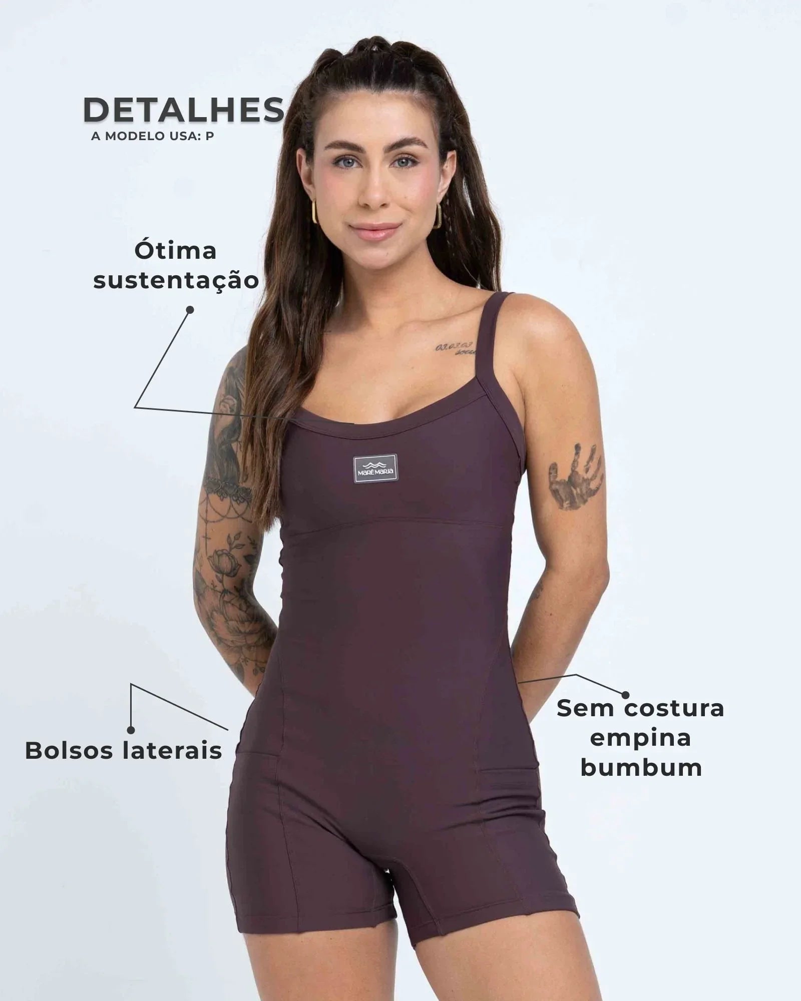 Na parte superior, o busto é valorizado com costura abaixo do seio e estrutura interna com entrada para bojo removível, oferecendo sustentação suave. As alças são mais largas e firmes, sem reguladores, garantindo conforto sem apertos durante os movimentos.
