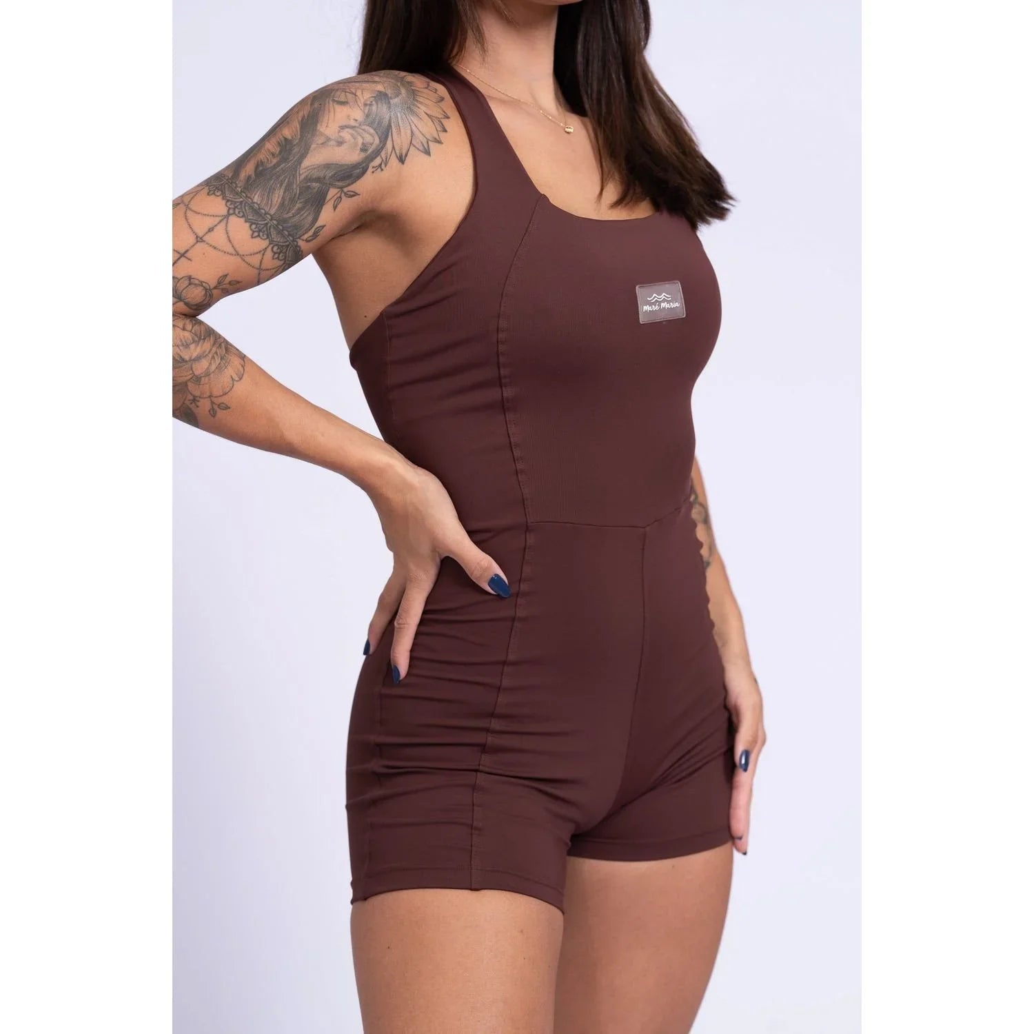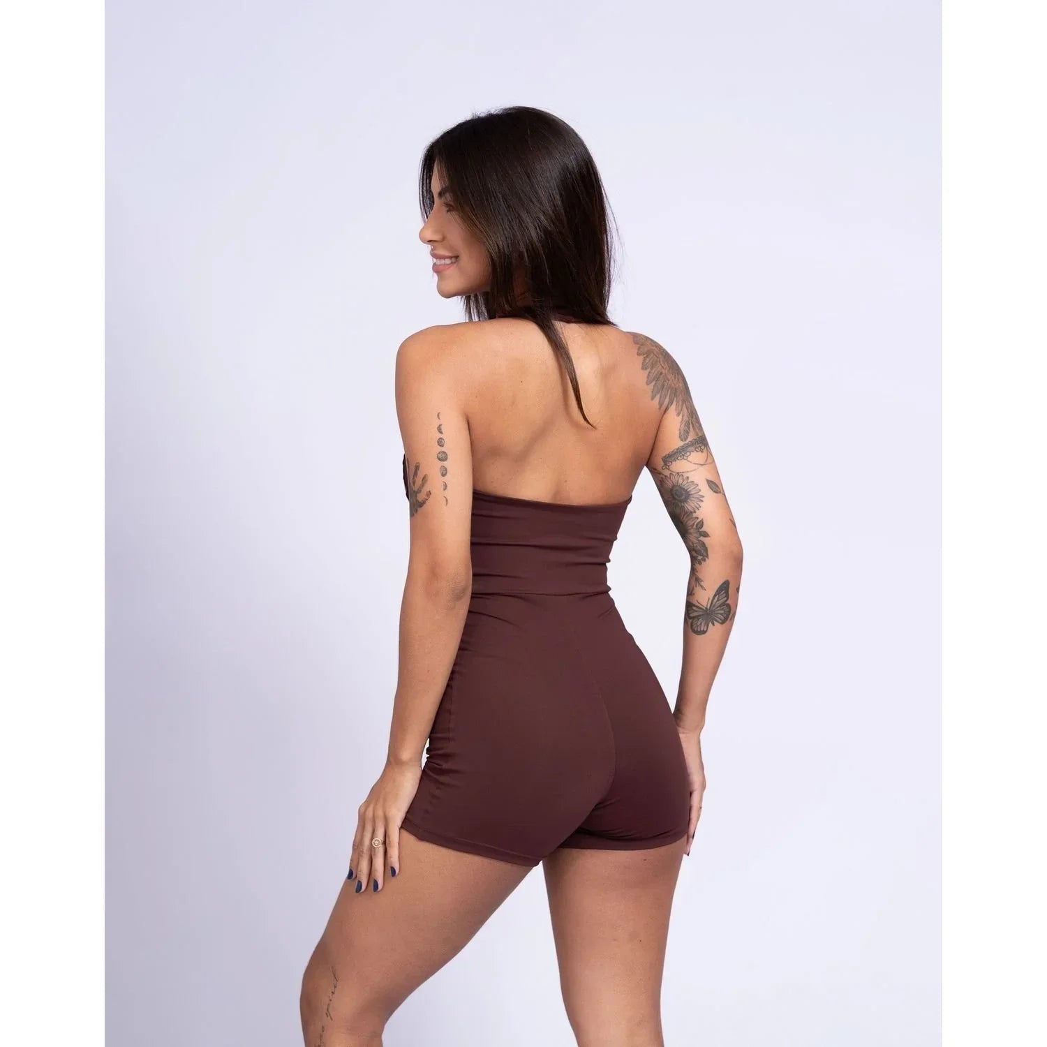 Combine o Macaquinho Native Chocolate Dark com tênis esportivos e acessórios minimalistas para um look moderno e confortável. Perfeito para exercícios físicos ou um dia casual com estilo.